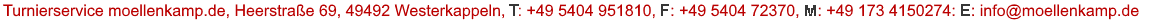 Telefonnummer Meldestelle: 0173 4150274; Adresse des Turnierplatzes: Balkumer Grenzweg 18 (Zufahrt über die „Balkumer Straße“, NICHT über „Unterm Gehn“), 49565 Bramsche